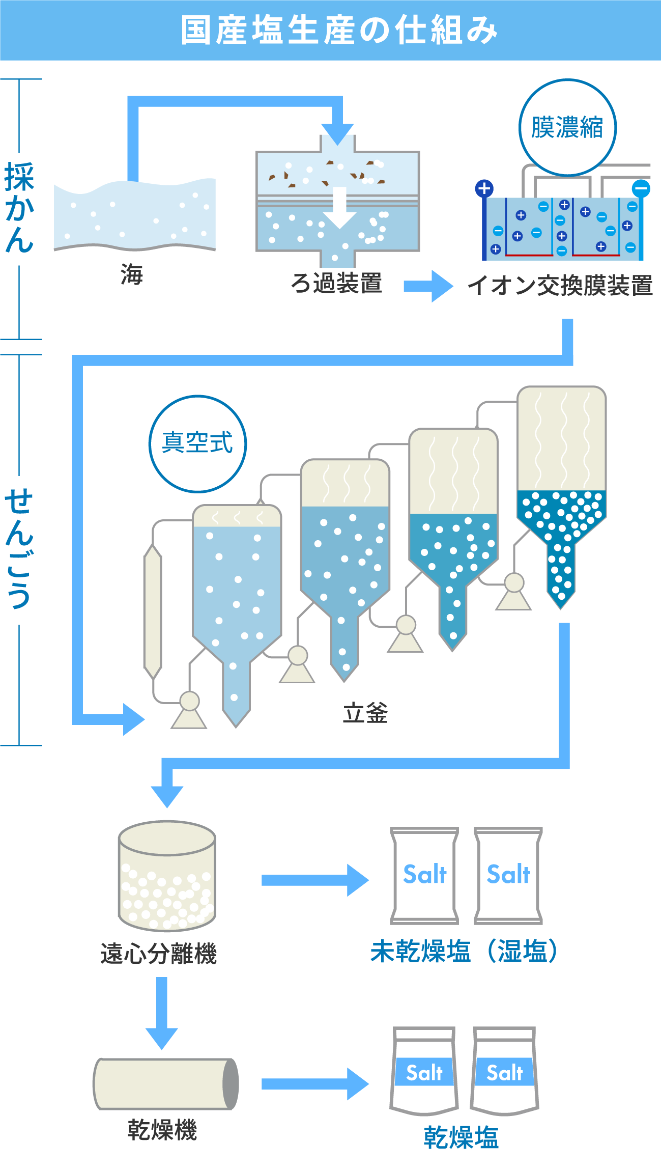 国産塩作りは、塩田濃縮せんごう塩から膜濃縮せんごう塩に変わり、製塩は自動化され、工場生産に変わっていきました。