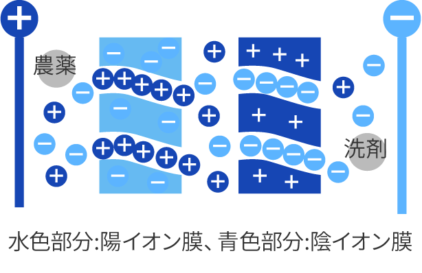 3%の塩分濃度の海水を、陽イオンだけを通す陽イオン交換膜と陰イオンだけを通す陰イオン交換膜を交互に配置した槽に入れ、両端から電流を流します。海水にはナトリウムなどのプラスイオンと塩化物などのマイナスイオンが含まれており、イオン交換膜はこれらのイオンを選択して透過させる性質があります。そのため、濃縮したいイオンだけを通すことで、海水から濃い塩水を作ることができます。海水の汚染成分には細菌類、生活排水、船底塗料などさまざまなものがありますが、塩分のイオンに比べて大きく、イオンにならないため除外できます。